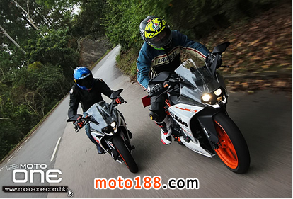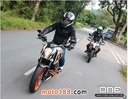 以接近相同規格開發的RC390及DUKE390,除了大包圍及座姿外,引擎加速反應 及避震吸震性能相當接近。但如果讀者是跑車迷,相信較喜歡大包圍的RC390,正如車主Henry在上一輯專欄形容車輛的座姿非常賽車化,乘座時十分俯 伏;這樣形容是因為同級的入門級日本大包圍只有輕微俯伏感,甚至跟NK街車的畢直座姿十分相似,雖然較長時間駕駛也很舒適,可是欠缺了一點賽車味;另一方 面,即使KTM RC390的正宗賽車化俯伏座姿較容易疲倦,但配合輕巧車身及窄轪把在山路上奔跑可享受更靈活轉向反應及準繩入彎角度,這是駕駛RC390最好玩之處,也 是在600或1公升大包圍跑車上無法找到的樂趣。