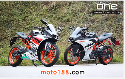 而三大賽事使用的落場版RC390也近乎原裝街車,沒有改動引擎,只作基本調校及更換 少量改裝部件,例如蝎子賽車排氣管及頭尾牙等等,并把街道用的睹后鏡及車頭大燈移除,所有改裝部件都是可購買的KTM POWERPARTS,據廠方公布落場版的極速由原裝的175km/h提升至190km/h。畢竟KTM在早年二沖WGP125及現在四沖 Moto3(250cc)世界賽投入了大量資源開發戰車,因此獲得了豐富數據,要開發高性能入門級大包圍街車是沒有太大難度,關鍵是車輛的外型能否打動買 家而矣。