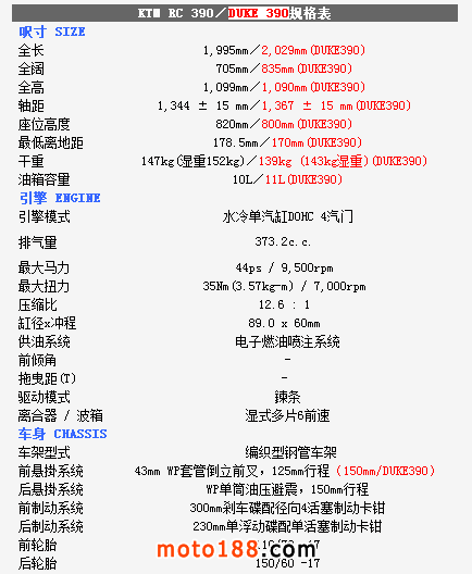 水冷散熱雙凸輪軸DOHC 4汽門單缸引擎、44ps馬力、高壓縮比、鮮橙色圓型鋼管車架、43mm WP倒立前叉、WP長沖程Progressive彈弓尾避震、300mm剎車碟配對向4活塞放射式卡鉗......KTM以這個規格設計了兩款車輛,分別 是新款大包圍RC390及NK街車版DUKE 390,雖然兩臺車均屬入門級車輛,但性能卻高于入門級車種的要求,其精準彎向表現、敏捷加速反應、原裝避震設定及掣動力,也可以讓老手大呼「好玩」。