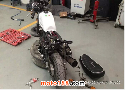 買來的車前后泥瓦是黑色的,看起來雖然沒有違和感,但是總覺得不會很對味,改。直接送到朋友的改裝廠(專改各種高大上的豪華汽車),還好廠里的小師傅也是個摩托愛好者,聊得挺投緣,超級細心耐心地拆車。為了妥妥地噴漆,我親自上陣打磨漆面。哈哈哈,下面就是改造過程。?