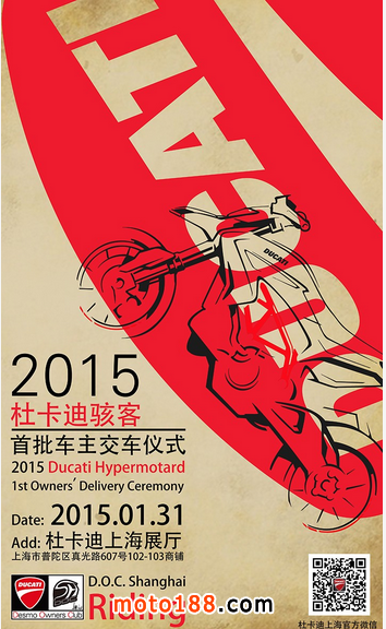 本周六去哪里玩兒?來杜卡迪上海展廳~ 2015 年首批 Hypermotard 駭客交車儀式即將在上海展廳舉行。豐富的活動,精美的餐點,以及奪人眼球的表演環節,現場還為各位準備了小禮物~ 交車儀式結束以后, D.O.C 上海還為各位車主組織了激動人心的騎行活動。詳情請見以下海報~