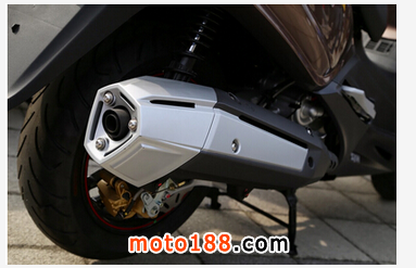 前制動為雙碟配備,SYM 原廠對四幅卡搭載275mm 碟盤,標配ABS 防死鎖剎車系統,后輪為單碟,單活塞卡鉗配275mm 碟盤,輪胎為前15吋、后14吋的配置,五段可調式后懸吊,相當具有特色的前后LED燈具也跟MAXSYM 400i 相同,有點不同的是排氣管防燙蓋,是與Fighter 6 差不多的六角型設計。
