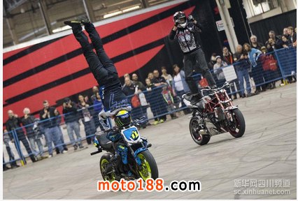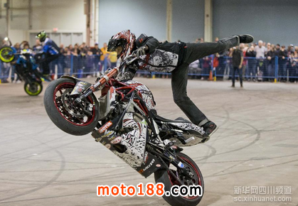 核心提示: 2月22日,一位車手在展示特技駕駛。當日,2015年加拿大多倫多摩托車展推出摩托車特技展示活動。特技車手大膽、驚險的表演讓觀