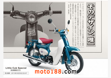 本田公司為紀念Super Cub通過了日本立體商標認證,推出全新配色的“Little Cub特別版”。這款Little Cub特別版定于2015年2月13日起于日本正式限期發售,至2015年3月29日發售截止,售價237600日元。