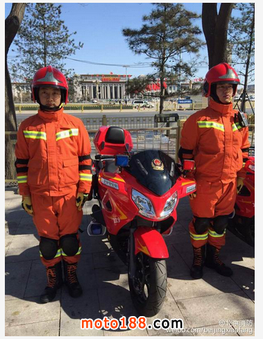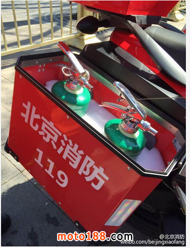 據北京市消防局官方微博“北京消防”消息,2015年兩會期間,北京消防的新型消防執勤摩托車,配備有小型滅火器和破拆工具,具有靈活機動、處置快速的特點。