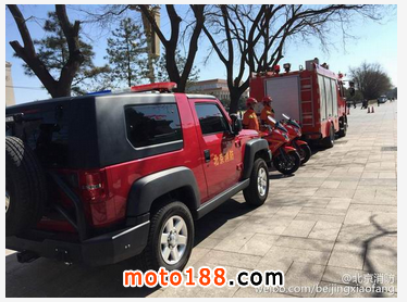 核心提示: 據北京市消防局官方微博北京消防消息,2015年兩會期間,北京消防的新型消防執勤摩托車,配備有小型滅火器和破拆工具,具有靈