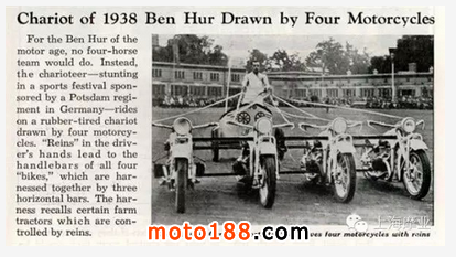 摩托車戰(zhàn)車,很像古羅馬時(shí)期的車展。這種比賽在1920年代達(dá)到了頂峰,此后一直持續(xù)到1930年代才逐漸衰落。遺憾的是,當(dāng)時(shí)的比賽選手是如何駕馭這樣的戰(zhàn)車的,目前已經(jīng)沒人能夠搞明白了。比如有的戰(zhàn)車手,能夠同時(shí)駕馭四輛摩托車組成的戰(zhàn)車。