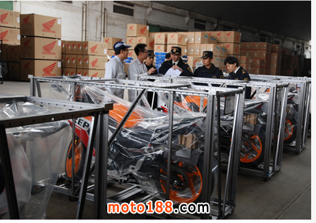 近日,在五羊-本田摩托(廣州)有限公司(下稱五羊本田)特設(shè)的海關(guān)外驗倉庫內(nèi),832輛進(jìn)口大排量摩托車CBR300整齊碼放著等待查驗,這批價值人民幣三千余萬元的高端摩托車。即將通過增城口岸首次登陸中國。