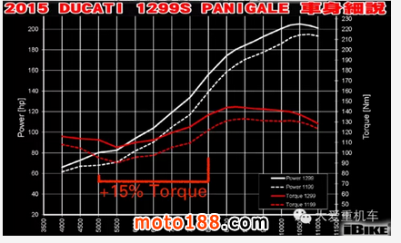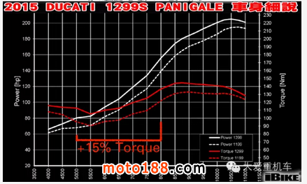 先說(shuō)說(shuō)引擎,Engine由1198cc撥大到1285cc,個(gè)piston bore比1199大了4mm到116mm,壓縮比是12.6:1,而這幅引擎要用上全新設(shè)計(jì)的活塞,Liner,新曲軸,新連桿。結(jié)果1299得出的馬 力是205匹,大1199差不多10匹,杻力145Nm,也比1199大10多Nm。
