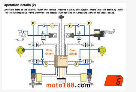 ●圖片顯示著車后,當車速超過6km/h,電索摩打、活門及壓力感應器開始啟動,讓C-ABS進入預備狀態(tài)。