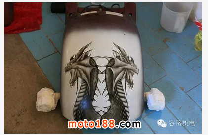 一個小小的油箱上,龍是活著的,并且如此淋漓盡致,當龍跟摩托車結合在一起的時候,就是一件活著的藝術品。彩繪的過程是痛苦的,新入手的愛車為了披上美麗的外衣,被拆的七零八落。油箱上面的彩繪,打掉原漆的時候,手顫抖了。。。。。。
