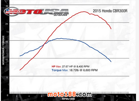2015 本田CBR300R將目光直指川崎忍者300,較CBR250R比起來(lái)有了很大的進(jìn)步。需要說(shuō)明的是雖然稱它為CBR300R,但其真實(shí)排量只有286cc,即便如此,它卻只比296cc排量的忍者300少6.7匹馬力。而CBR300R在6600轉(zhuǎn)的時(shí)候就可達(dá)到最大功率18.72lb,相對(duì)于忍者300的最大功率17.37lb/10000轉(zhuǎn)來(lái)說(shuō),力量來(lái)的更快更直接。直到8400轉(zhuǎn)左右的時(shí)候,兩輛車的表現(xiàn)不相上下,越往后,本田開始處于劣勢(shì)。這是單缸機(jī)的優(yōu)勢(shì)同時(shí)也是缺點(diǎn)所在。