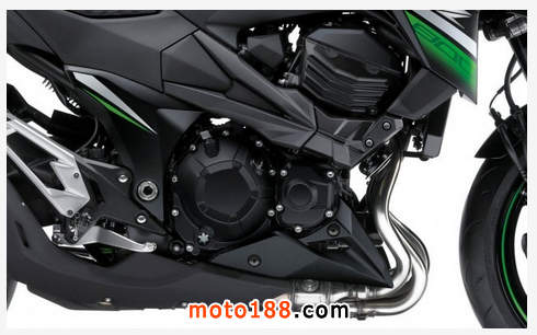Z800搭載了一臺806cc的四缸16氣門的發動機,川崎表示這款Z800是中級街車中性能最強的車型之一。34mm的Keihin節氣門響應非常迅速,川崎的工程師為Z800設計了兩套不同速度下的進氣回路保證發動機能夠運行在最高效的狀態;六速變速箱的齒比設定較為緊湊,加速表現相當出色,并且第六檔的齒比設定非常適合高速巡航。