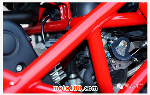 接著看到被稱為 L 型雙缸的 V型90度雙缸引擎,這顆由 DUCATI 制作的雙缸引擎,在 8000rpm 時能爆發出 81hp 的馬力數值,而在 6250rpm 時則能提供 7.7kg-M 的扭力輸出,對于這樣輕量化的車體而言,帶來的樂趣已經非常多。