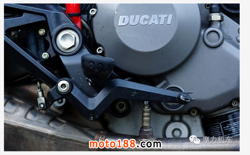 來到車輛左側,引擎本體以及打檔桿的部份,這臺車配備國際六檔,而打檔桿為無后移不可調設計,另外可以看到每缸的火星塞帽,火星塞規格為 NGK DCPR8E;但看了引擎右側后,又看到這張引擎左側,為何都沒有看見 DUCATI 的招牌特色之一干式離合器呢?因為在 Hypermotard 796 上,DUCATI 采用車系中較少見的濕式離合器,該組濕式離合器是由意大利專業離合器公司 ADIGE 所生產的 APTC? 滑動式離合器,因此在引擎剎車的抵銷程度,以及加速的離合器貼緊方面,都有不錯的騎乘感受,同時也拜油壓離合器與總泵所賜,離合器并不需要太大力,即可輕松操作。