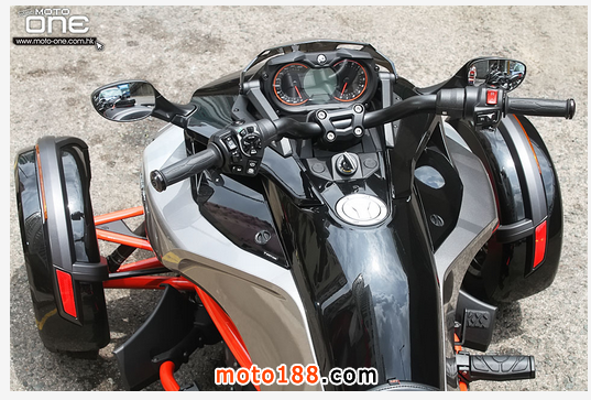 表面看來沒甚么特別的電單車把手,卻擺有如汽車般的動(dòng)力輔助,作用就等同風(fēng)油軚,令扭 動(dòng)一對(duì)165/55 R15前胎毫不費(fèi)力,225/50 R15超闊大尾輪負(fù)責(zé)驅(qū)動(dòng),把手邊設(shè)3段角度調(diào)節(jié),加上可變角度與高度的腳踏,完全切合駕駛?cè)说膶?shí)際需要。這是廠方的UFIT系統(tǒng),亦可稱之為人形工學(xué)。 更要一提的是改變了的前傾角與拖曳距,比前作SPYDER縮窄了76.2mm,令其具備更敏銳的轉(zhuǎn)向反應(yīng),大家都不等留意到2輪跑車同樣採(cǎi)取如此變量去改 變車子的轉(zhuǎn)向反應(yīng),就連3輪車子也採(cǎi)用同策略。但這個(gè)就犠牲了若干的車頭儲(chǔ)物空間,凡事總有代價(jià)。