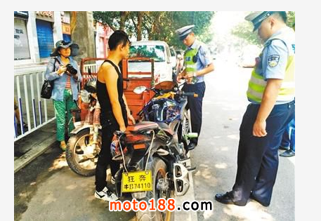 上午10點左右,記者來到位于職教中心的檢查點發(fā)現(xiàn),執(zhí)法人員剛好攔截到一輛“特別”的摩托車,車主為一名20歲的男子。