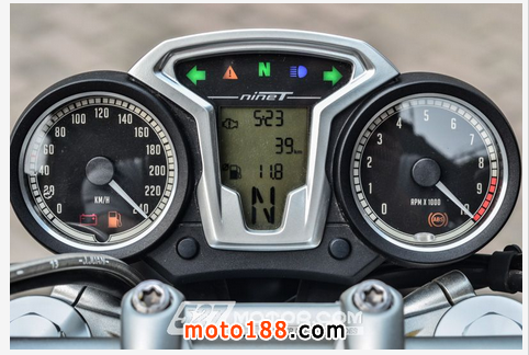 圖說:圓形轉(zhuǎn)速表和速度表,構(gòu)成古典的雙圓盤結(jié)構(gòu),烘托精煉質(zhì)樸的韻味;信息豐富的多功能顯示屏,提醒你這是最前衛(wèi)的復(fù)古街車。