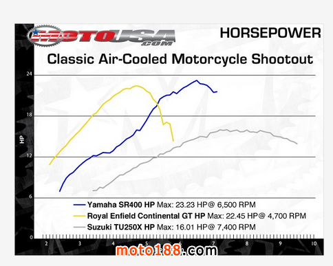 功率測試中,雖然皇家恩菲爾德的排量最大,但功率卻不是最大的,雅馬哈以微弱的優(yōu)勢領(lǐng)先。