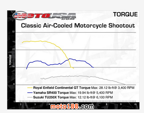 排量優(yōu)勢完全體現(xiàn)在了車子的扭矩上,皇家恩菲爾德以最大扭矩38.12N.m的優(yōu)勢遙遙領(lǐng)先,比鈴木TU250X的扭矩的兩倍還多。