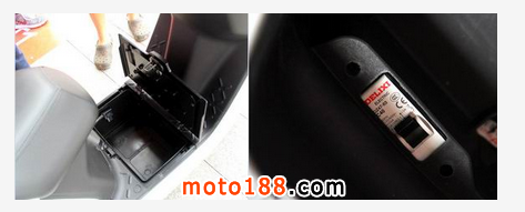 工作人員把機械鑰匙往左擰,車座彈起,只見角落里有個鑰匙孔,然后機械鑰匙插入一擰,腳踏板的蓋子就打開了。只見一個黑色的電池嵌入其中。
