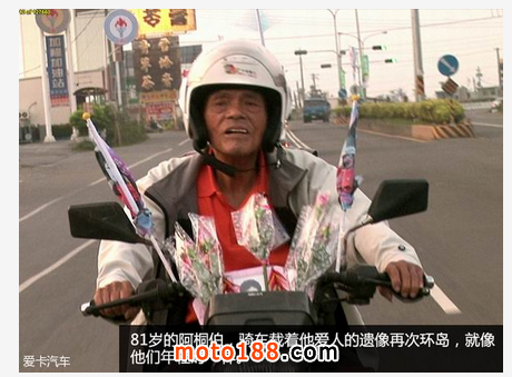 在他們之中,一位人稱阿桐伯的老者讓我格外敬佩。他此次環島的目的,是要完成對妻子的承諾。年輕的時候,阿桐伯每年都會載著妻子環島騎行。一個美麗的傍晚,妻子問他:“我們環島,你還能載我多久?” 他回答:“若80歲時我還活著,一定還會載你。”憑著這樣一句簡短的話,81歲的阿桐伯再次出發,但他的妻子卻在21年前永遠的離開了。
