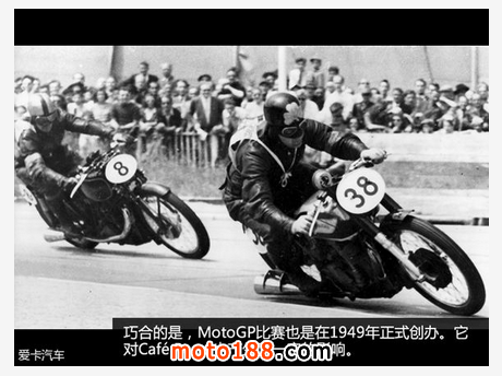 那時的Ace Cafe里,人們除了咖啡、搖滾樂和摩托車以外,還有一個共同的愛好,那就是MotoGP。巧合的是,這項賽事由于戰爭原因,也順延至了1949年才正式開始。Café Racer受到了GP的極大影響,連摩托車改裝風格也與當時的GP賽車相仿。