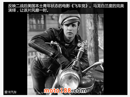 提及Harley-Davidson,也讓我想起了1953年上映的《飛車黨》,馬龍白蘭度的完美演繹,以及那句叛逆的:“我們曾經是英雄,但如今誰也不需要我們了”,讓那部電影風靡一時。這是一部反映當時美國非法機車黨的電影,起因是《時代》周刊登出的一張照片,照片描述了二戰后某些士兵的頹靡狀態,可以說他們是當時社會的最不穩定因素,而摩托車也成為了他們的標志之一。所以直到現在,摩托車在許多人們心中也是一種負面的形象。