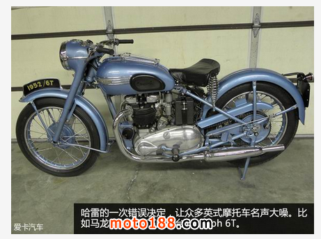 此外,有些比賽選手會將兩臺不同品牌的摩托車整合到一起。比如,他們會把Triumph的發動機,安裝到Norton或者BSA的車架中。或把Norton發動機安裝到Vincent中。因此出現了一些如Triton、Tribsa、Norvin等奇怪的稱謂,其實是把兩個摩托車品牌的部分字母拼湊在一起,以彰顯這臺車的身份。要知道,能做到這點的人,是要有一定經濟實力的。
