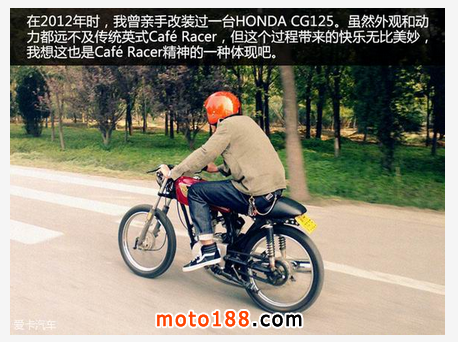 現在看來平白無奇,但在當時,這樣的一個稱號可以說是“無上的榮耀”。所以為了它,眾多愛好者開始對自己的愛車進行重度改裝,以得到更快的速度。那些退伍士兵的機械知識則得到充分發揮。在不斷摸索以及GP比賽的啟示下,他們認為將車把設計成分離式,油箱形狀細長且兩側帶有凹槽(讓膝蓋可以緊貼油箱)的形式最為出色。