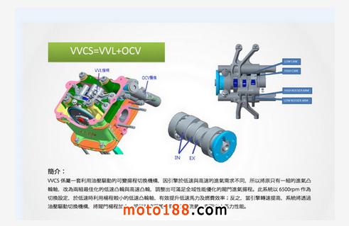 低速時所需要的氣流較少, 所以使用低角度的凸輪軸,高速時所需要的氣流較多, 所以使用高角度的凸輪軸,用這種方式來兼顧低速扭力和高速的馬力表現。