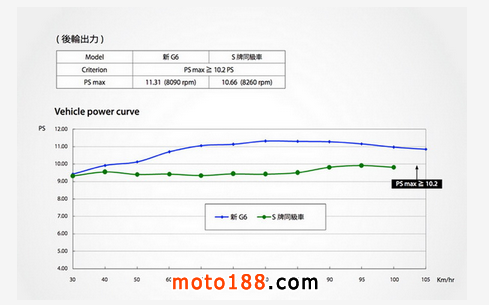活塞也進行了輕量化,讓新G6的引擎馬力, 比前代更為提升。就算是測量后輪的馬力輸出,也有很大的提升。