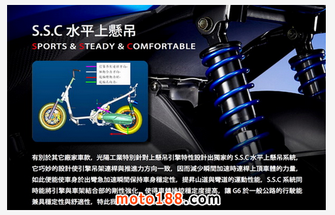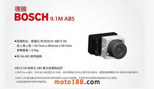 除此之外,新G6還配備頗受好評的SSC水平上懸掛,德國Bosch的9.1M ABS系統,新的浮動式碟盤。
