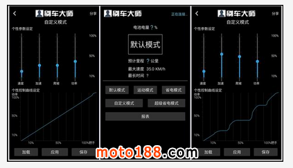 ▲預(yù)設(shè)三種騎行模式,分別為:默認(rèn)模式、運動模式、省電模式三種。除此之外,用戶還可以自定義模式,通過調(diào)節(jié)車輛的加速度、輸出功率、爬坡表現(xiàn)等來設(shè)定一套自己喜歡的騎車模式。