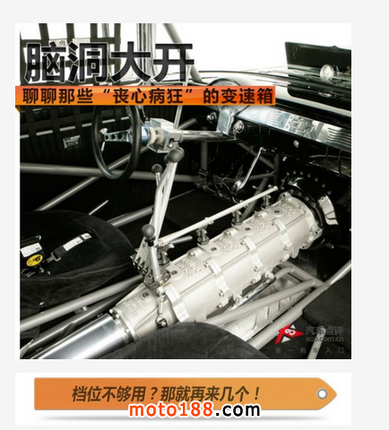 △ 嗯,車子起步需要扭矩,那么一個(gè)檔用來起步,那跑起來之后,二擋就作為“高速擋”使用了。至于你擔(dān)心的扭矩問題,你覺得美國(guó)人的大排量情節(jié)難道不會(huì)在賽車上發(fā)揚(yáng)光大么?動(dòng)輒好幾升排量的發(fā)動(dòng)機(jī)會(huì)欠缺動(dòng)力么?少年,你太幼稚了!