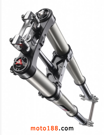 為配合全新設(shè)計的車架,WP 4CS頭叉從新調(diào)節(jié),無需任何工具即可調(diào)校至車手要求度數(shù),右方頭叉頂紅色扭制預(yù)調(diào)回彈油壓,左方白色扭制負(fù)責(zé)調(diào)節(jié)下沉油壓,方便易用,賽車場上分秒必爭,如此設(shè)計居功不少。