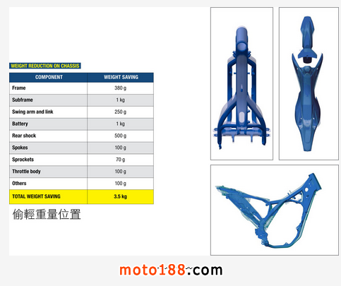 水滴形、雷射切割、由機械人銲接的車架正好將引擎緊致地包裹起來,新設(shè)計、高質(zhì)物料等皆由WP PERFORMANCE SYSTEM全程包辦,令全新車架比起舊有的省卻380g重量,成功的車架,設(shè)計自然帶來更理想的操控性。