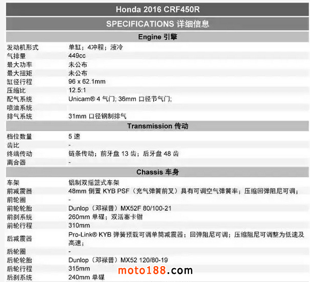 Honda(本田)的引擎自然不用擔心,他們將 2016 年的重心放在了對減震升級的方面。也許,僅對這幾處作出簡單的調整預示著 Honda(本田)的團隊將更早地開始 2017 款 CRF450R 的研發,據傳,2017 款將是一款全新的產品。