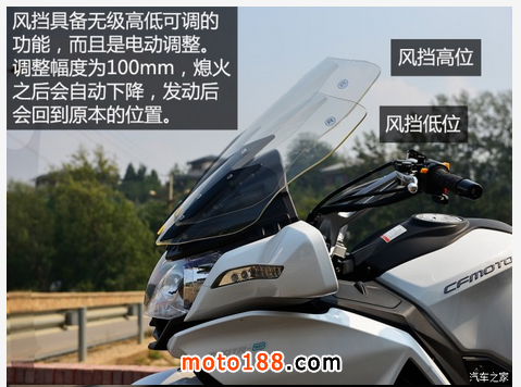 電動(dòng)可調(diào)風(fēng)擋是650TR-G傲人配置之一,國產(chǎn)車中應(yīng)該沒有其他車有這種配置。有了這個(gè)風(fēng)擋,能確保騎士在長途旅行中不被氣流沖擊,有效減低疲勞感,而且具備電動(dòng)升降就代表你不用因?yàn)橐{(diào)整風(fēng)擋而停下車。我在騎行中試著將風(fēng)擋調(diào)到最低與最高,發(fā)現(xiàn)差異還挺大的,如果調(diào)到最低,氣流直接吹到我的胸口,調(diào)到最高的話,氣流則剛好從頭頂上方經(jīng)過,如此一來能夠讓氣流正好吹進(jìn)頭盔的風(fēng)道里增加通風(fēng)效果,又不至于讓頭部受到太多的氣流沖擊。