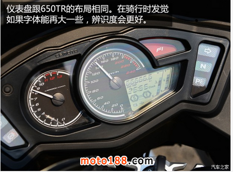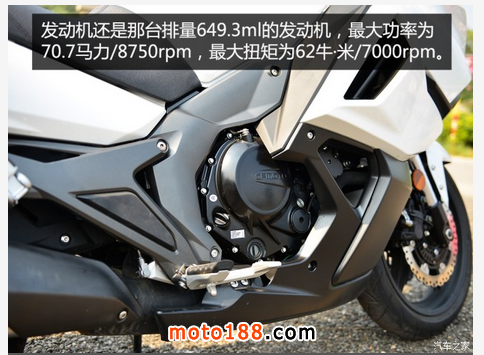 發(fā)動(dòng)機(jī)雖然輸出功率沒有改變,但是現(xiàn)場650TR的車主在試駕650TR-G后宣稱,650TR-G的發(fā)動(dòng)機(jī)轉(zhuǎn)速提升較650TR更加迅速。根據(jù)原廠所提供的信息,650TR-G的0-200米加速是8.1秒,而650TR是11秒。不過原廠只有強(qiáng)調(diào)本車使用博世的電噴系統(tǒng),并沒有說明在發(fā)動(dòng)機(jī)上做出了哪些改變。