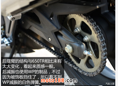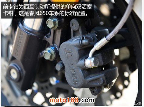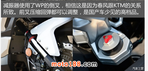 至于車輛的其他細(xì)節(jié),我個(gè)人認(rèn)為還算是對得起它59800元整的售價(jià),做工比起650TR似乎又更細(xì)致了些。另外,在配置方面還有一個(gè)亮點(diǎn),那就是春風(fēng)與知名減振器大廠WP合作,為它配上了可調(diào)式前叉,后減振也是WP的產(chǎn)品,至于實(shí)際體驗(yàn)的感覺,我們將會(huì)在體驗(yàn)的環(huán)節(jié)中提到。