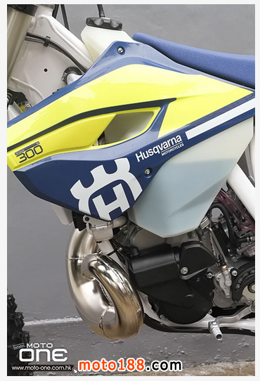 Husqvarna TE300挾54ps馬力峰值傲視云云對手,比TE250多岀50c.c.,馬力與扭力高出相當,但竟然只有104.4kg的車子乾重,僅比前者多出 0.2kg,秘密在那里?其實沒有秘密,只是大量采用剛度適中的輕合金,除了那鉻鉬合金車架,大概可以包括稱之為高拉力鋼管車架吧。當然是非一般鋼管,這 個在TE250文 中己介紹過,在此不再重提,現在就著眼於她的乾重,證明在開發TE250時,各零部件已預留充裕的強度去應對更大馬力/扭力的輸出,主要的零部件無需作出 改動去迎合,只是汽缸孔徑改動72mm,活塞行程維持TE250的72mm,即72x72mm缸徑/活塞行程以1:1比例實屬罕見。