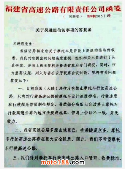 我偶然看到了一封我國(guó)省級(jí)政府部門(mén),給咱們摩友的一封“回復(fù)函”。在這封信函的第一條答復(fù)中,福建省政府直接告知了當(dāng)事人,我國(guó)沒(méi)有任何不允許摩托車(chē)上高速的法律。而且主動(dòng)承認(rèn)了,雖然福建地方法規(guī)規(guī)定了本省高速禁摩,但是無(wú)效的。因?yàn)檫@規(guī)定與“上位法”相悖!(具體信函如下圖)
