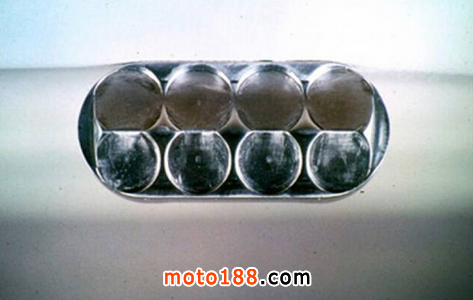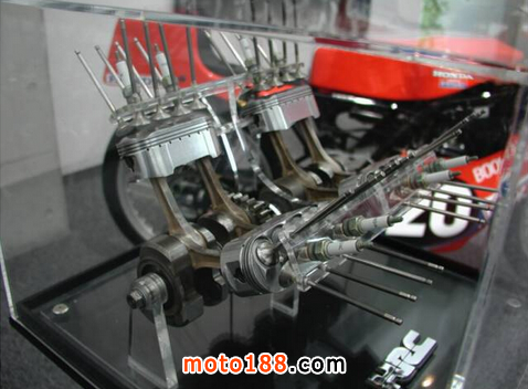 為了完成這一挑戰,Honda 生產出世界上獨一無二的“橢圓氣缸“,為了提高轉速及氣缸內的燃燒速度并符合FIM的500CC賽車氣缸不得多于4個的比賽條例,設計師們還以天馬行空的創造力將V8引擎相鄰的兩個活塞合并為一個,于是橢圓活塞的神話就此誕生。