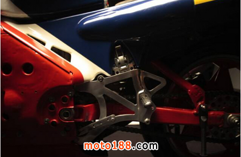 重量決定了比賽時的圈速。設計師把減重的目光投向了車架,他們要用1/4的重量,達到1倍的強度。于是在汽車上使用的承載式結構概念,被引入到NR500的車架設計中。本田朝霞研究所的神谷忠為NR500研制了“蝦殼”式車架。所謂“蝦殼”式車架,就是以一層薄殼包裹發動機,使發動機成為車架的一部分,從而提高強度,減輕重量。