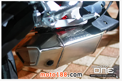 ●HYOSUNG GD250R的原裝排氣管,受環保法例影響,巨大的催化增加了排氣管的體積及重量。