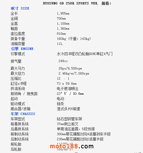 今年初登隆香港的HYOSUNG GD250R,主攻入門級大包圍市場,經濟的車價成為賣點之一。HYOSUNG GD250R配置水冷四沖程雙凸輪軸DOHC單缸4汽門引擎,排氣量是249cc,馬力輸出28ps,採用電子燃油噴注供油。車身其它裝備也不失禮,例如採用37mm倒立前叉,提供5段預調的側置式尾避震(一般採用中置式),讓車輛看起來較特別,還有經過設計的尾擔及液晶體儀表板等等,可看到設計師花了不少心思。