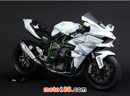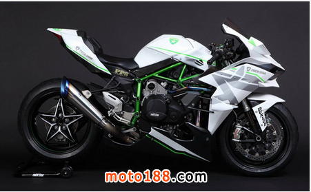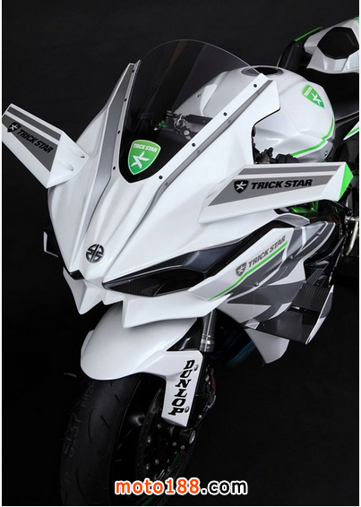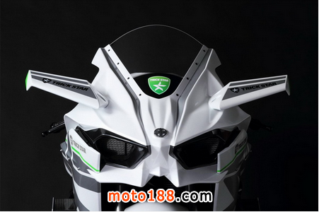 核心提示: 全碳纖包圍及定風翼配上白色拉花後非常耀眼。 超過三百匹馬力輸出、機械增壓引擎及車頭上的定風翼,使賽道版的KAWASAKI H2R