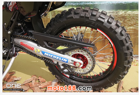 一般來說,正宗達(dá)卡戰(zhàn)車的特徵是配置高風(fēng)擋、大燈保護(hù)殼及強(qiáng)制安裝在軑把上的路線指南閱讀器護(hù)架及GPS器材護(hù)架等等,而這臺達(dá)卡概念車包含以上元素,這臺車另一亮點(diǎn)是配置了無限的排氣管。CRF250 RALLY跟原裝CRF250L相比,保留了金色的43mm倒立前叉、鋼絲輪框及尾擔(dān)等等,但上眼鏡、軑把、座墊及腳踏等等則改用更高級部件。這些改裝讓傳統(tǒng)爬雞外型的CRF250L看起來更特別及吸引。