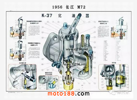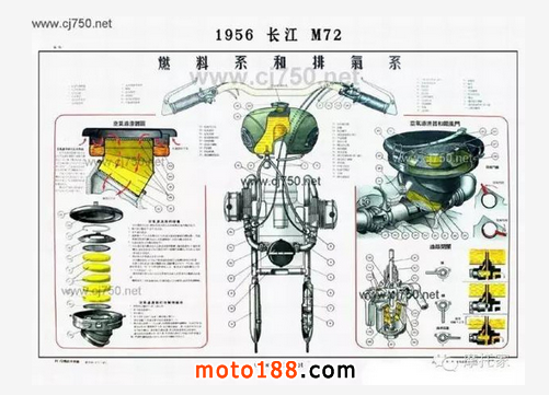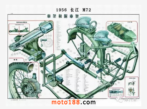 在洪都機(jī)械廠仿制的時候,由于參照實(shí)物是已經(jīng)去掉加熱系統(tǒng)的烏拉爾M72,所以根本無人知道原始的加熱設(shè)計。還有一項仿制中消逝的設(shè)計是風(fēng)門和動力分配擋,R71可以把30%的動力通過共軸直接輸出到挎斗上,并以手動拉桿的方式調(diào)節(jié),可M72則把風(fēng)門和動力分配擋挪到了腳的位置,并且不能將30%動力輸出到挎斗上。從寶馬R71到烏拉爾M72,再到洪都仿制版,也并不只是簡化,蘇聯(lián)人仿制M72很大程度上是為了大量裝備部隊,而中國的仿制版除了軍用,還承載著觀禮等多種設(shè)計任務(wù)。寶馬R71的挎斗沒有任何減震系統(tǒng),顛簸的路面乘坐起來很累,洪都仿制版拋棄了烏拉爾M72的挎斗結(jié)構(gòu),創(chuàng)造了一套中國化的挎斗避震支架。